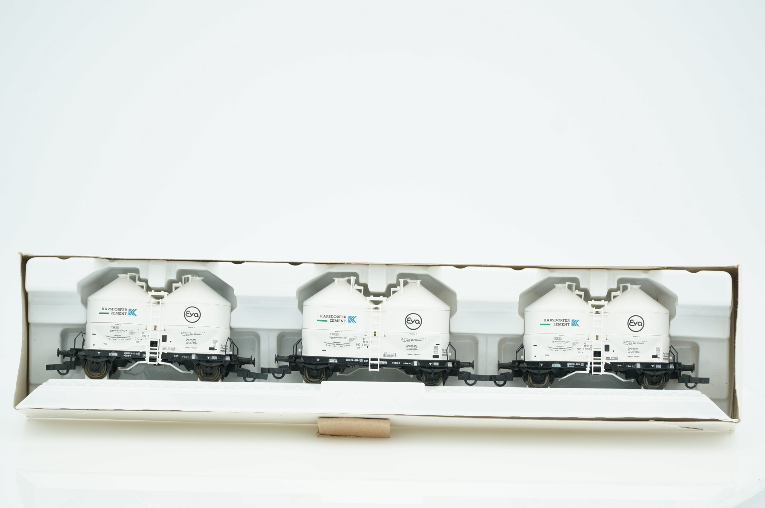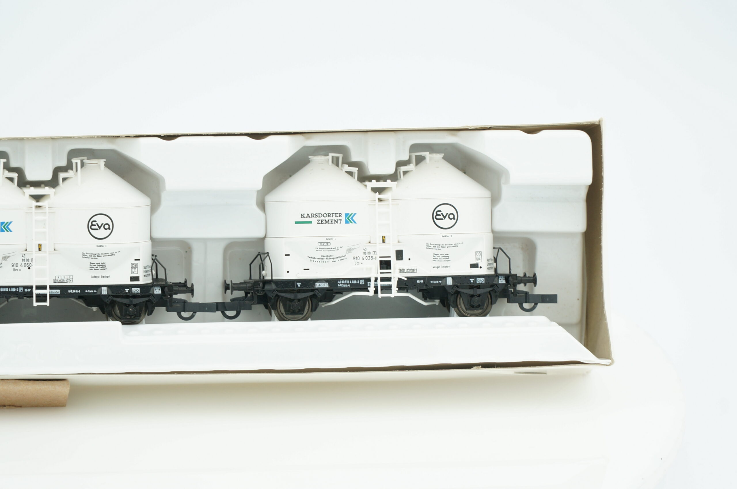 Roco 44055 ist ein mit „Eva“ und „Karsdorfer Zement“ gedrucktes Silowagen-Set der Deutschen Bundesbahn (DB).